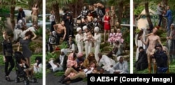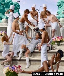 Мы познакомились в начале 1990-х. Особо запомнился наш общий с Таней и Львом Новый год, шумно отпразднованный в Базеле. Тогда как арт-группа они были только втроем, без фотографа Владимира Фридкеса, – Татьяна Арзамасова, Лев Евзович, Евгений Святский. Жени тоже в Базеле не было. Умяв гигантского новогоднего гуся и опрокинув русской водки, решили прогуляться на Marktplatz. К 0.30 город полностью опустел, и перед нами предстала волшебная картина: ночная, чуть припорошенная снежком площадь, сплошь уставленная початыми бутылками шампанского самых дорогих мировых брендов... Так и хочется соврать, что именно с этой, полной шампанского магической ночи, полностью подтвердившей, что новогодние мечты сбываются, началась грандиозная мировая карьера АЕS+F. Хотя это и очевидное вранье, началась она гораздо раньше. И все же очень скоро об этой российской арт-группе, работающей в жанре инсталляции, фотографии, видеоарта, скульптуры и всех их возможных и невозможных гибридов и смесей, узнал весь мир. В самом названии легко угадывается аббревиатура из имен участников группы. Работы AES+F отсылают зрителя к различным культурным стилям, эпохам, комментируя при этом самые насущные нынче проблемы – противостояние восточной и западной культур, глобализация, избыток новейших технологий, словом, весь тот ад, из которого, в сущности, и состоит современная цивилизация.